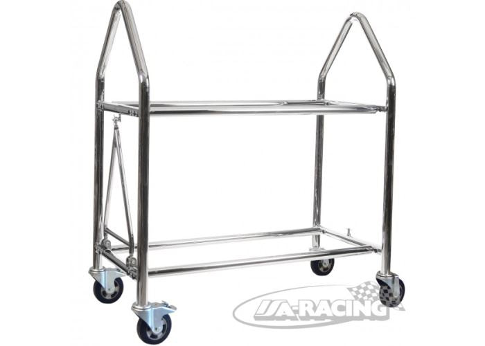Standard-Ausführung mit nutzbarer Länge von wahlweise: 1300, 1500, 1600, 1800, oder 2000mm. Für verschiedene Reifengrössen ist der Abstand der Längsträger auf 400mm, 475mm und 550mm einstellbar. Der Wagen ist mit zwei festen und zwei voll drehbaren, feststellbaren und bremsbaren Aluminiumrollen ausgestattet, die für Festigkeit, Stabilität und leichte Manövrierbarkeit in Boxen, Fahrerlager und Werkstatt sorgen.