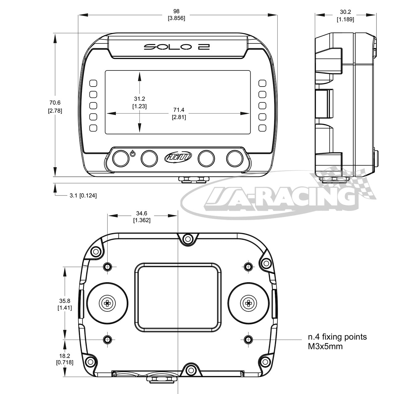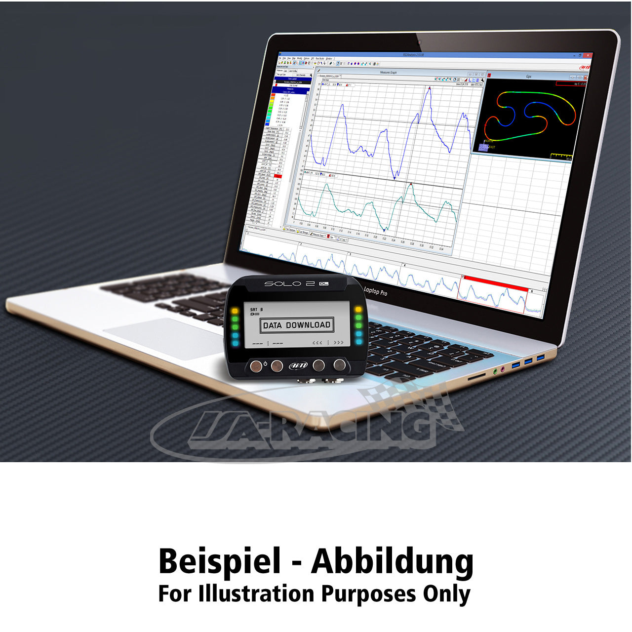 Lieferumfang: AIM Solo2 DL, Netzkabel mit AC-Adapter, 1 Verbindungskabel wahlweise (CAN/K-Typ externes Stromkabel mit OBDII-Stecker, externes CAN/RS232-Stromkabel, externes Stromversorgungskabel RPM (wenn Ihr Fahrzeug keine ECU hat)), Halterung mit Schrauben, Benutzerhandbuch