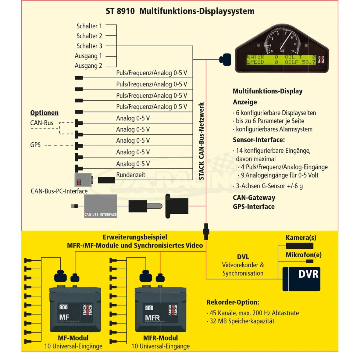Das ST8910 ist ein Multifunktions-Displaysystem, das Anzeige, Sensorinterface, CAN-Gateway und GPS-Interface in einem kompakten Modul vereint. Es entspricht bis auf den fehlenden Datenrekorder dem bekannten ST8916 Multifunktions-Datenloggersystem. Das ST8910 ist als Displayerweiterung für das ST8956S Multifunktions-Datenerfassungssystem konzipiert, kann aber auch als eigenständiges Anzeigesystem sowie als Anzeigeerweiterung für die STACK Videologger verwendet werden.