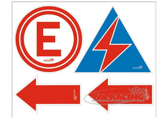 Selbstklebende Sicherheitssymbole gehören zu jedem Rennfahrzeug. E-Symbol, Blitz und Pfeile für Abschlepphaken....
